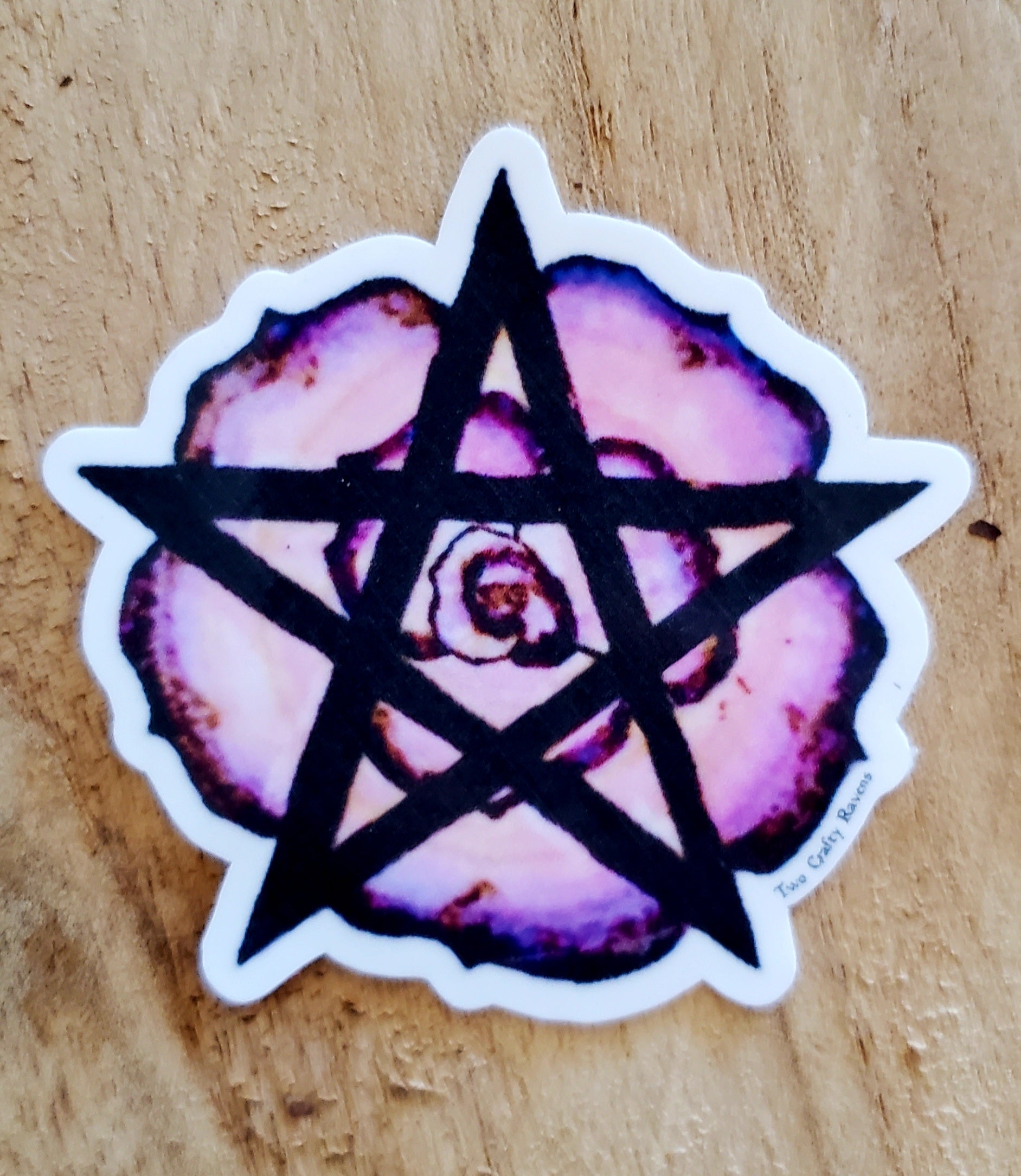 3 inches in diameter. The sticker form of our rose pentagram altar board. This sticker is from original artwork and a complete collaboration between the 2 Ravens. Ryn drew the initial concept and refined it. Rachel transferred and burned it into the wood and colored it, then made it digital and turned it into a sticker!
