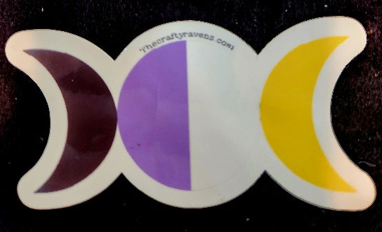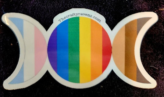 Show your pagan pride with these triple moon stickers with pride colors! Digitally drawn and painted. The sticker is 3.5"x2" and you can choose from LQBTQBIPOC, Lesbian, Enby, Bi, or Trans colors.