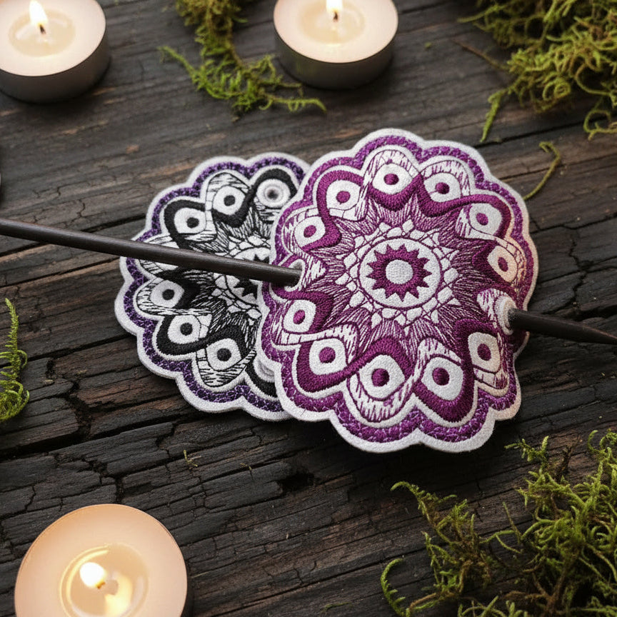 Hold your locks in mystical style with this enchanting hair holder featuring a mesmerizing zen spiral design. Crafted with shimmering silvery vinyl and adorned with delicate embroidered details in your choice of purple or black thread, it brings a touch of witchy magic to your daily routine. Perfect for those who embrace their spiritual side while keeping their hair perfectly in place. A whimsical accessory that's equal parts functional and fantastical.