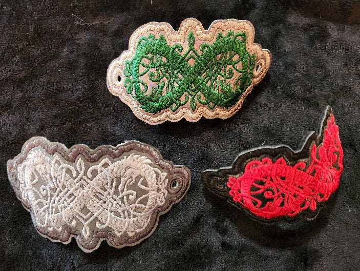 A beautiful, intertwining chinese dragon embroidered on vinyl with wood patterned stick to use to secure. Wirks beautifully with any updo.