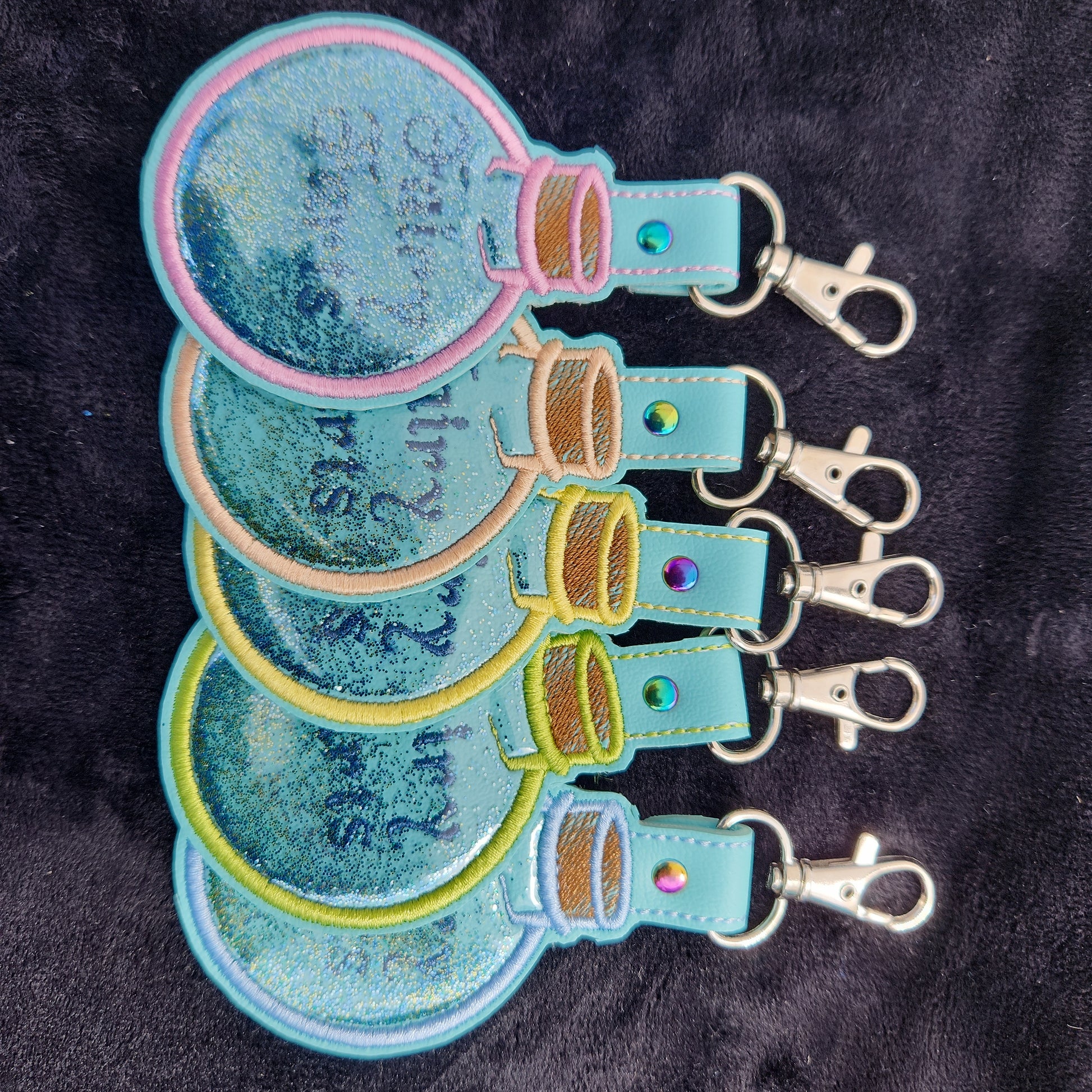 We captured hard to find fairy farts and added them to this keychain so you can carry them.with you! Crafted from blue vinyl with a clear overlay, the stitching is machine-embroidered and hand-finished, creating a smooth, durable finish. Inside is a generous helping of shimmering glitter, making it shakeable for extra fun. A lobster hook on top makes it easy to attach to any keychain.