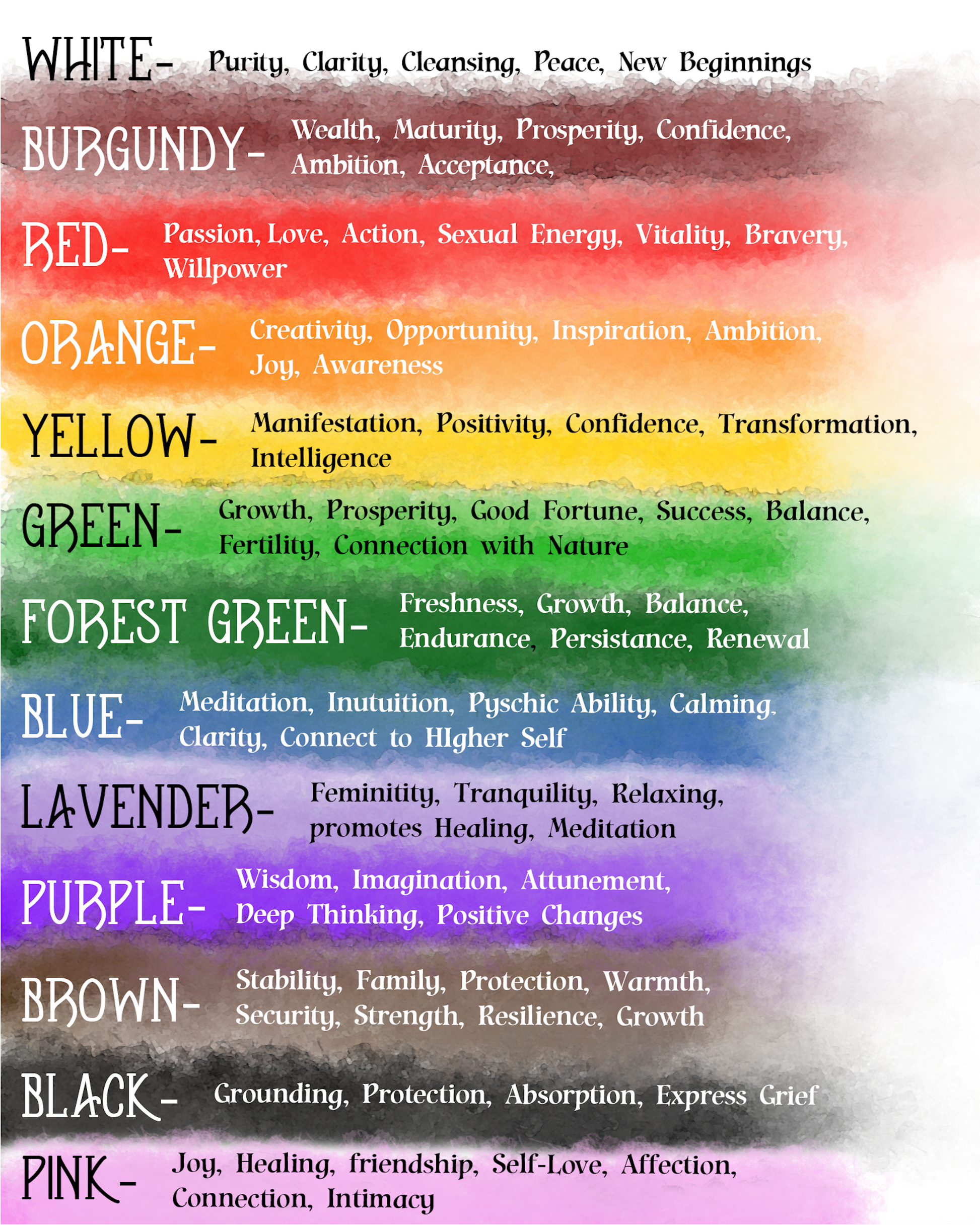 Printed and laminated version of the color info sheet. This is a quick reference guide to use with candle colors for intention setting during spell work.