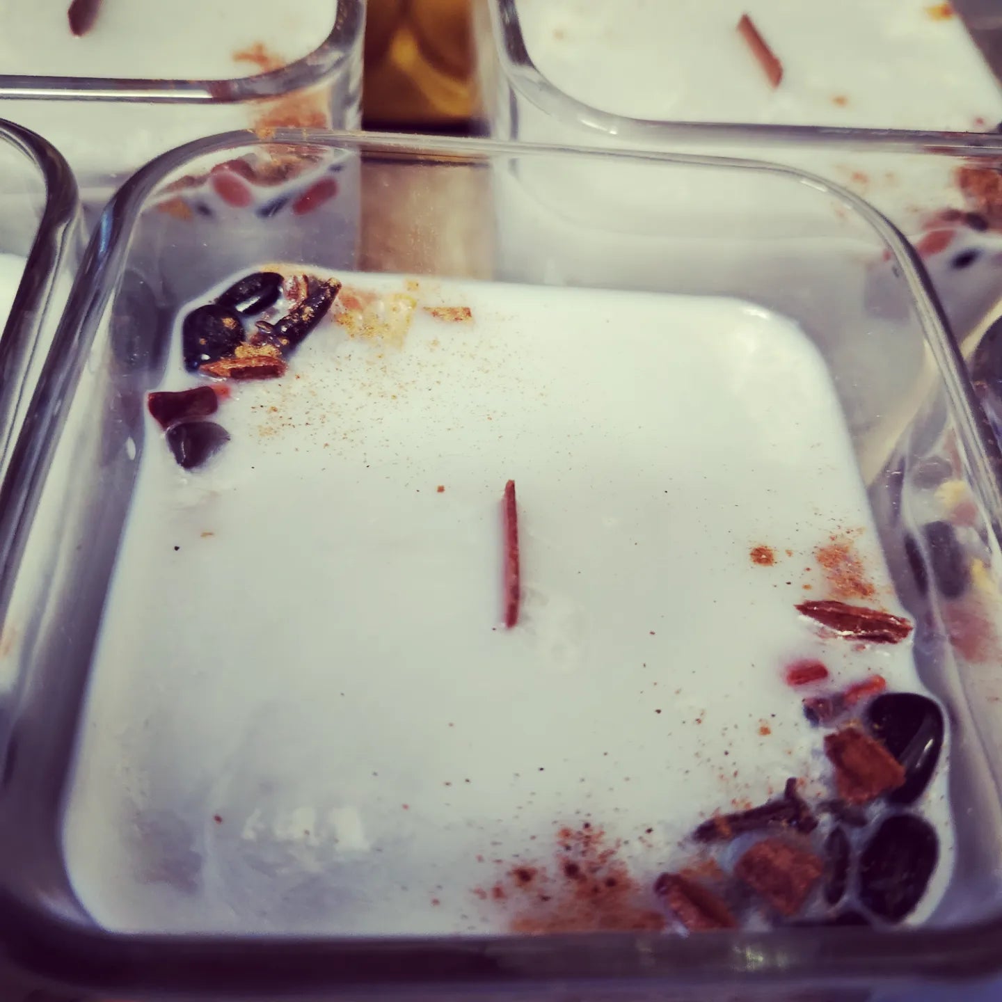 A candle for Samhain blessings, made with the scents of orange, clove, cinnamon, nutmeg, and vanilla. It is topped with carnelian, obsidian, and smoky quartz alongside clove, orange peel and a sprinkle of cinnamon. This candle burns to a pool of metallic black and purple. As always, they are made in small batches with a wood wick and soy wax. Only available for a limited time and limited sizes.