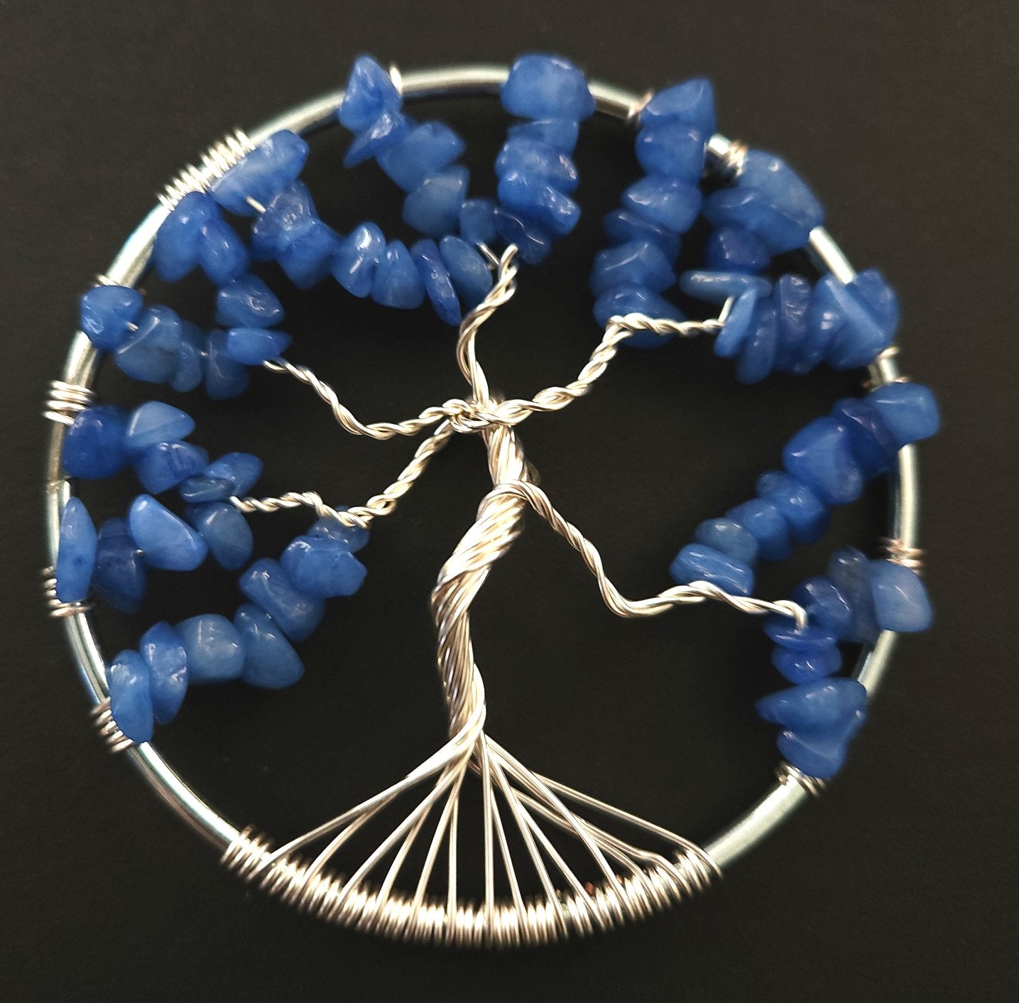 Each suncatcher is handmade and unique, so although they are similar in appearance no two are exactly alike. This 3" silver ring has blue aventurine crystals and tarnish resistant silver wire.