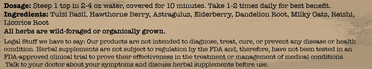Elderberry, Reishi, Dandelion Root, Astragulus Root, Tulsi, and Hawthorn Berry