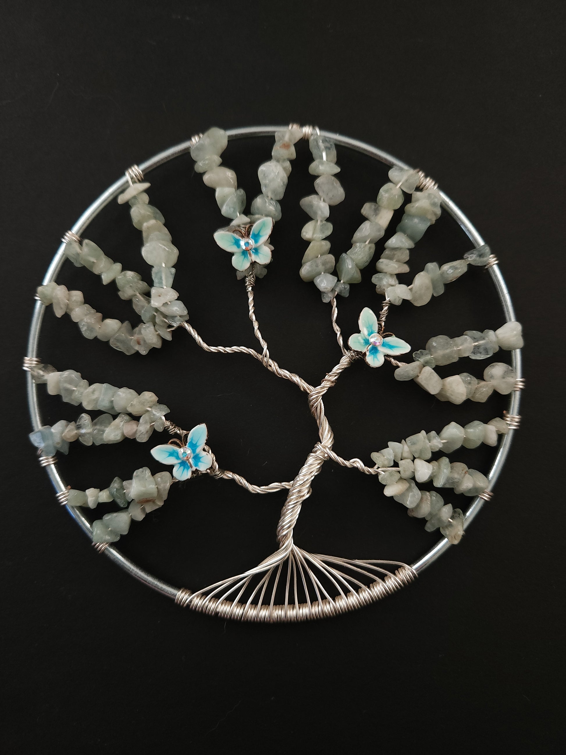 Each suncatcher is handmade and unique, so although they are similar in appearance no two are exactly alike. This 5" silver ring has blue labradorite crystals, tarnish resistant silver wire and butterflies flitting amongst the branches. The 3" silver ring has blue-gray labradorite crystals and tarnish resistant silver wire.