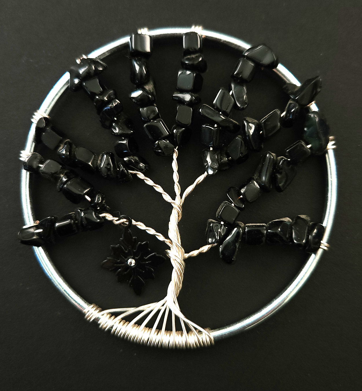 Each suncatcher is handmade and unique, so although they are similar in appearance no two are exactly alike. This 3" silver ring has obsidian crystals, tarnish resistant silver wire and an obsidian flower for embellishment.