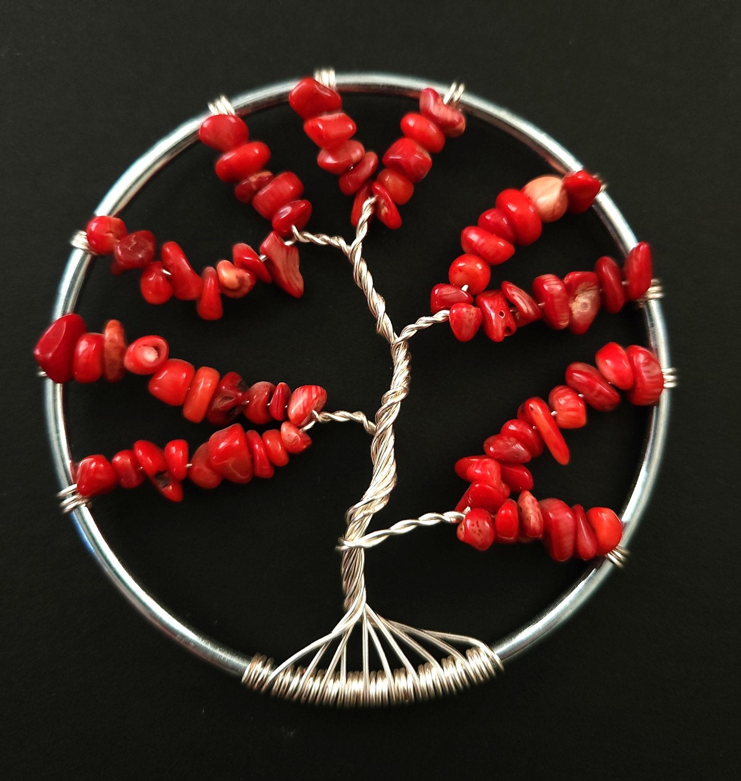 Each suncatcher is handmade and unique, so although they are similar in appearance no two are exactly alike. The 3" and 1.5"silver rings have red coral crystals and tarnish resistant silver wire.