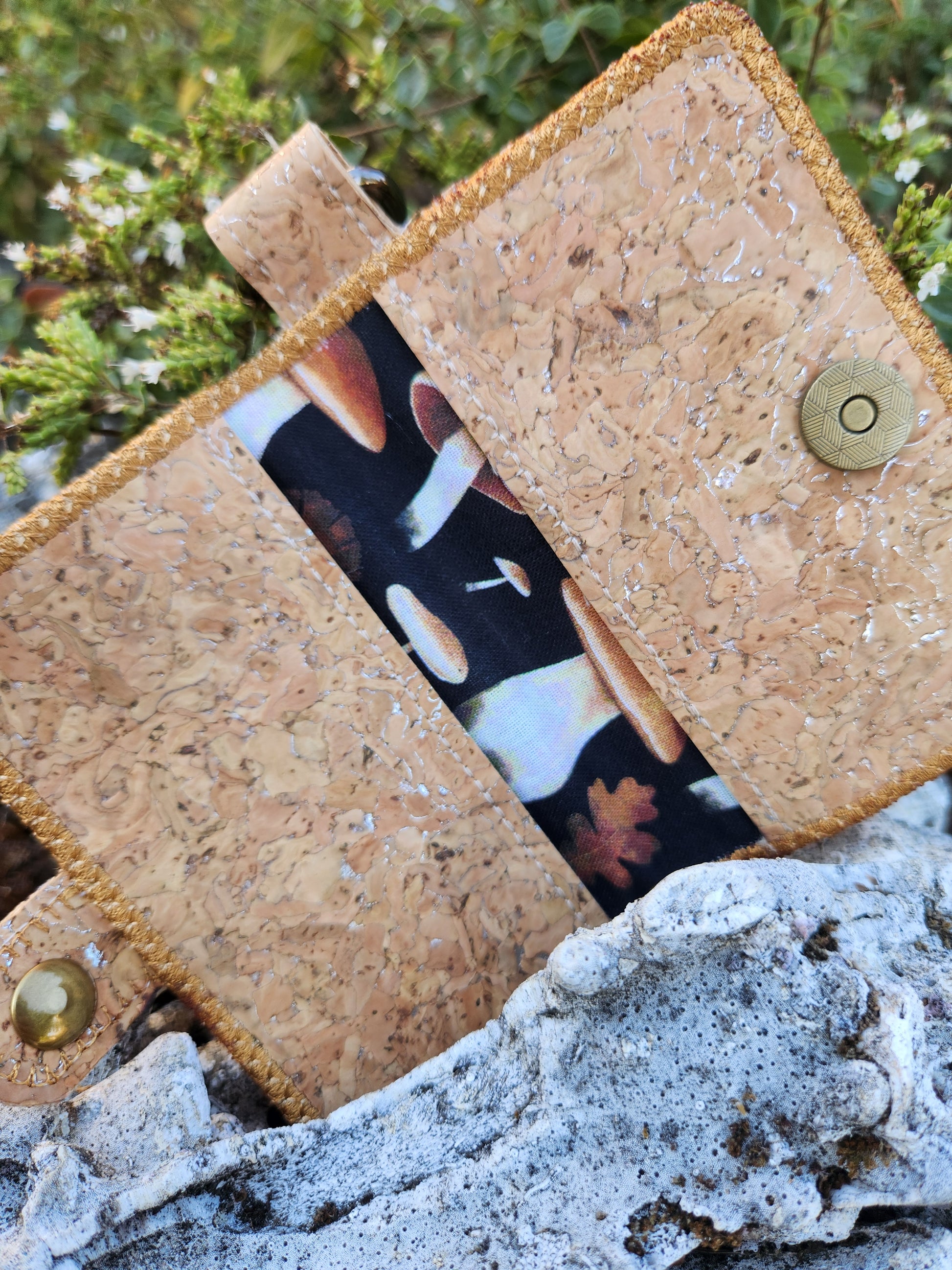 Are you a cottage core, mushie loving, forest walking, nymph? This cute little cork fabric wallet with bright red mushrooms and lined in mushroom cotton fabric is sure to delight you.