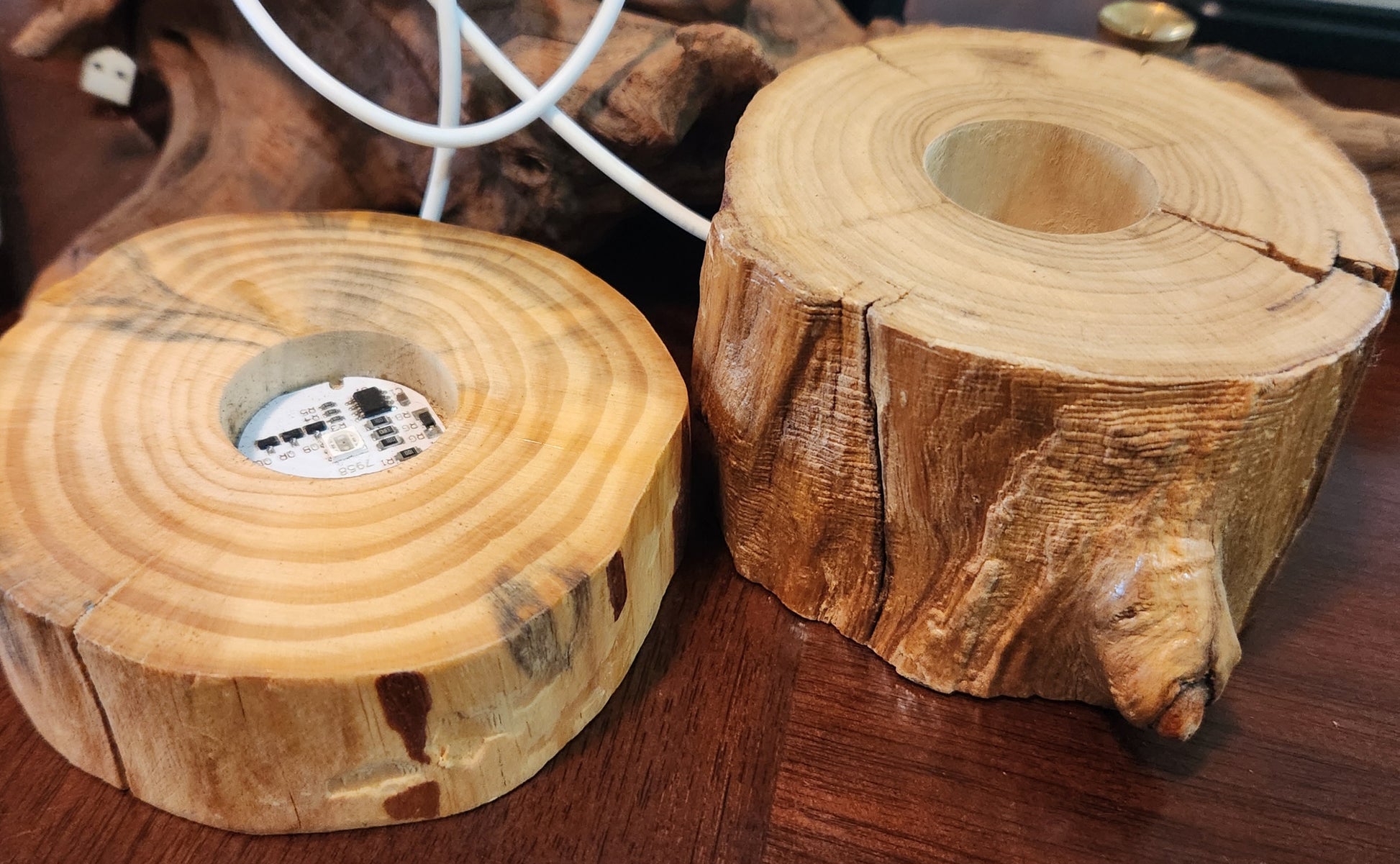 This stand adds a touch of nature to your display, resembling a tree trunk with raw edges. It features white LED lights and an on/off switch on a USB cord, and can hold various sizes of spheres. The stand has a 4" diameter and a 1.25" diameter hole for the sphere.