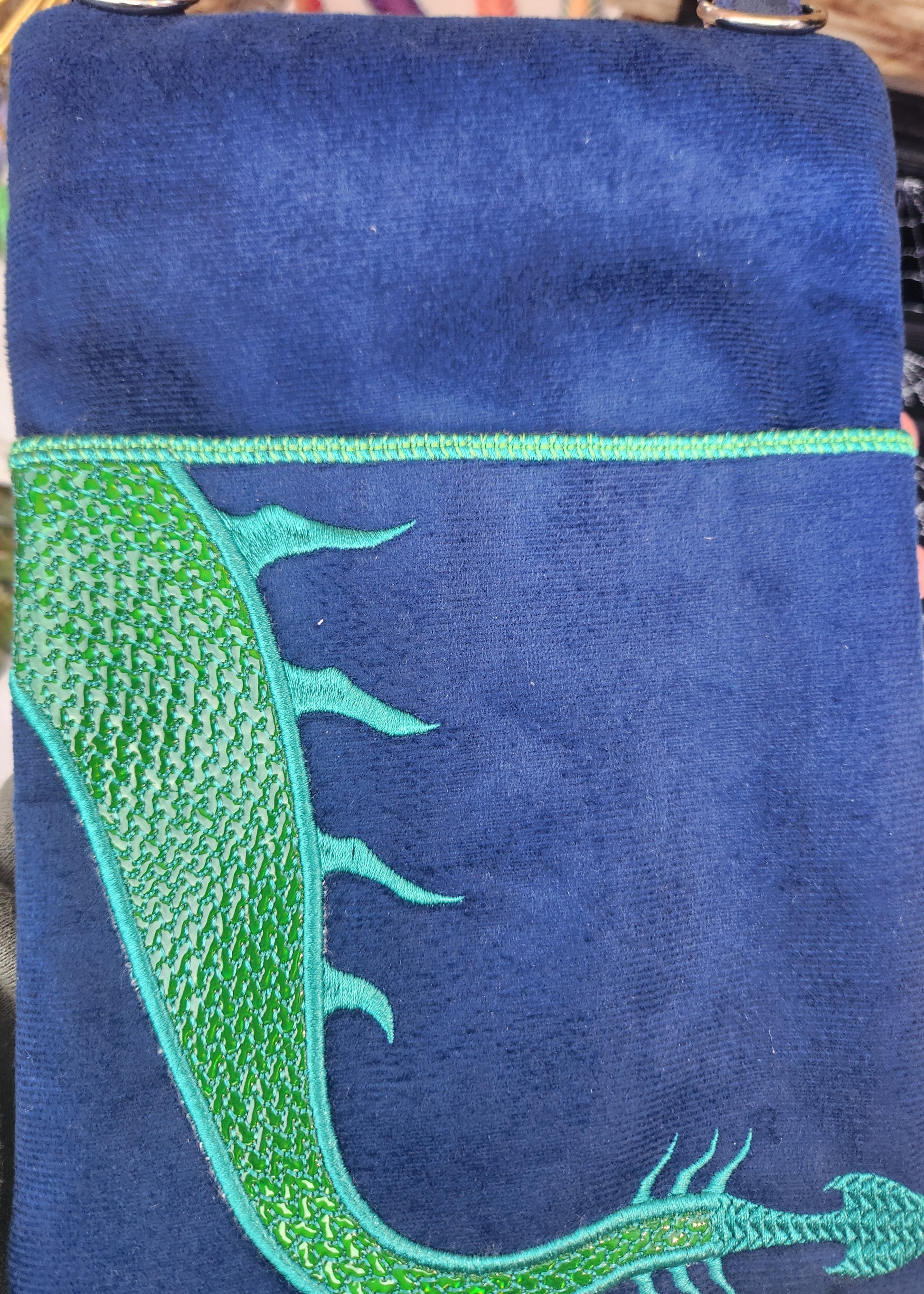 Machine embroidered and hand finished. Full zip, back pocket, handmade detachable strap, lined with cotton, and 2 rings to attach to a belt like a pouch. Other color options available as a custom order.