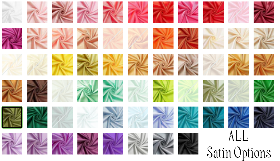 There are MANY more colors available than listed in the satin and several more in the velvet. Please see the swatches in the pictures. If you wish a different color combo, just email and ask.
